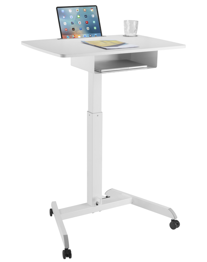 De StudyFit is een compact zit-sta bureau met voetpedaal, opbergvak, tabletgleuf en bekerhouder. Verstelbaar in hoogte en makkelijk te verplaatsen dankzij de stevige wielen.